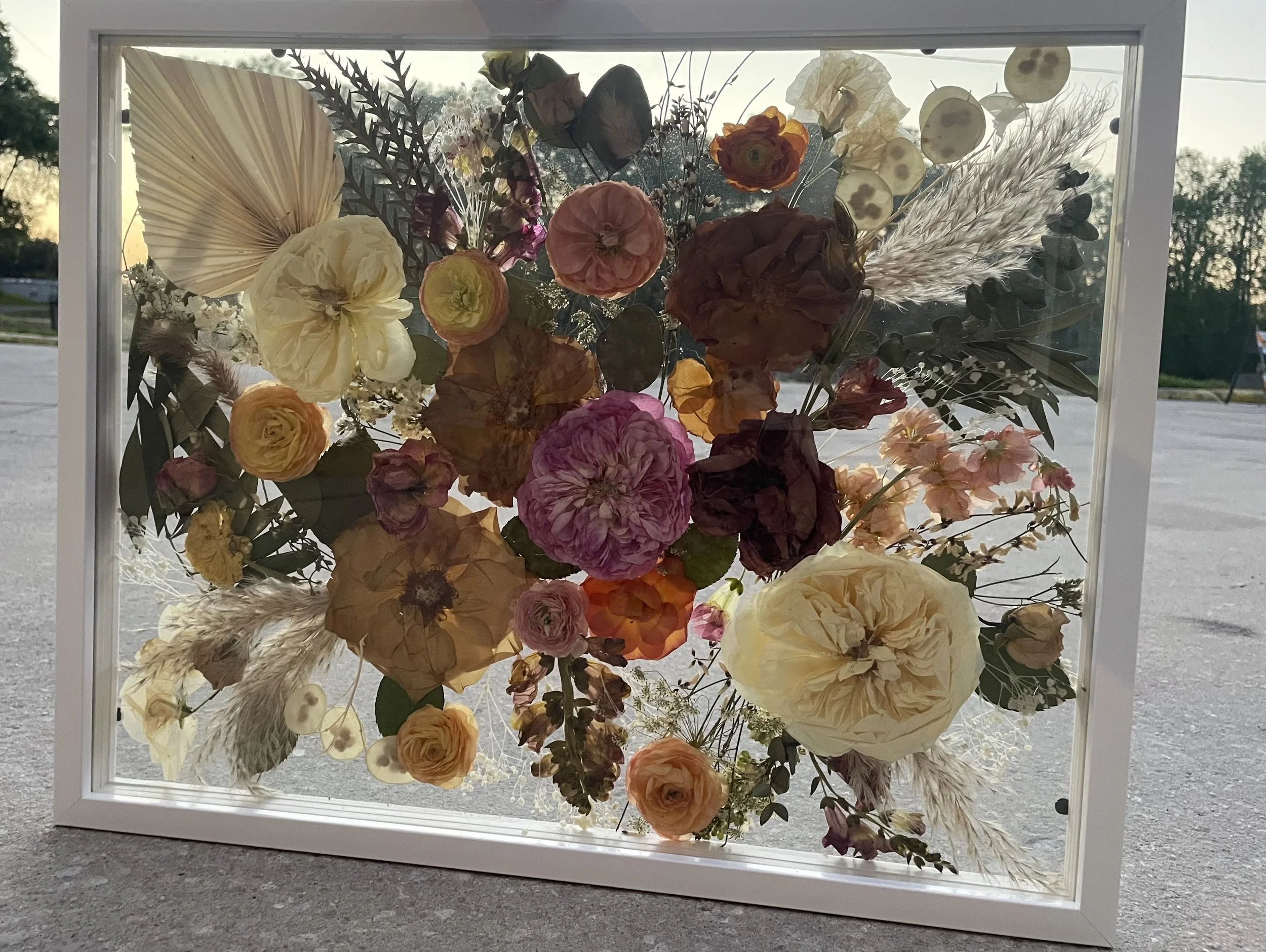 As a floral press artist, I am constantly on the forage and pressing things from my daily commutes no matter where I’m going. I try to throw a handful of flowers or foliage in a press at least every day. I take in around 5-8 wedding bouquets monthly as well, which I press and frame for the bride. I have to keep the spots limited, because pressing a wedding bouquet is way more tedious than wild or garden flowers, and I have to have press space for my market art! You can catch me at the riverside arts market most Saturdays or around town at other local pop ups, too.