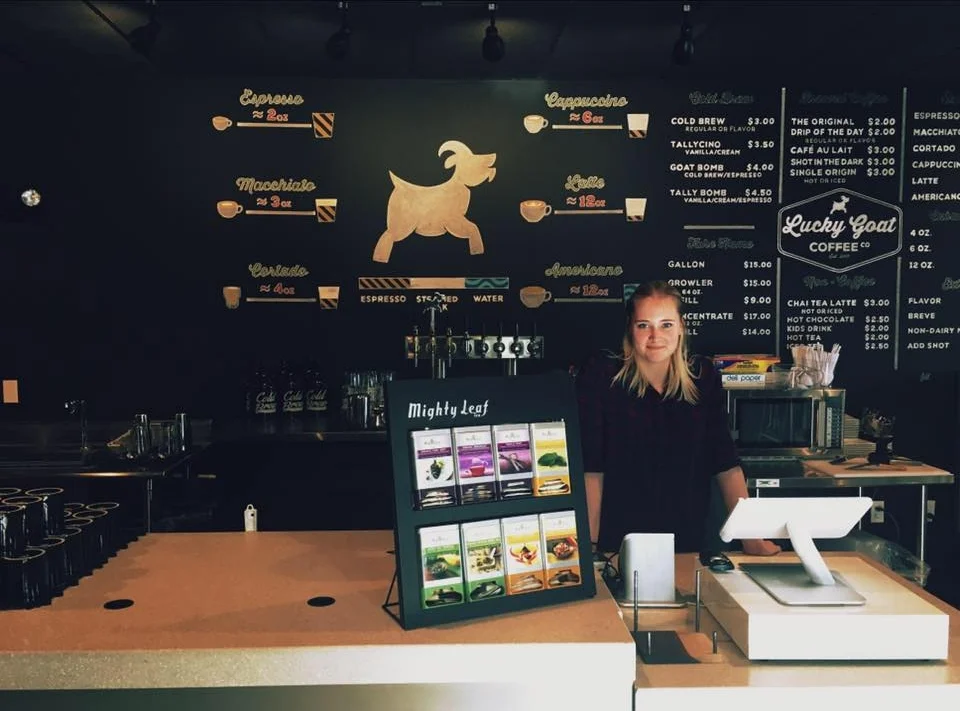I manage a local coffee shop in Tallahassee, FL called Lucky Goat (in our Midtown location.) When I started with the company in November of 2015, there was only one store, and I knew nothing about how a coffee shop worked. Since then, we’ve opened two more shops, and I was promoted to manage one after training to be a bar-back.