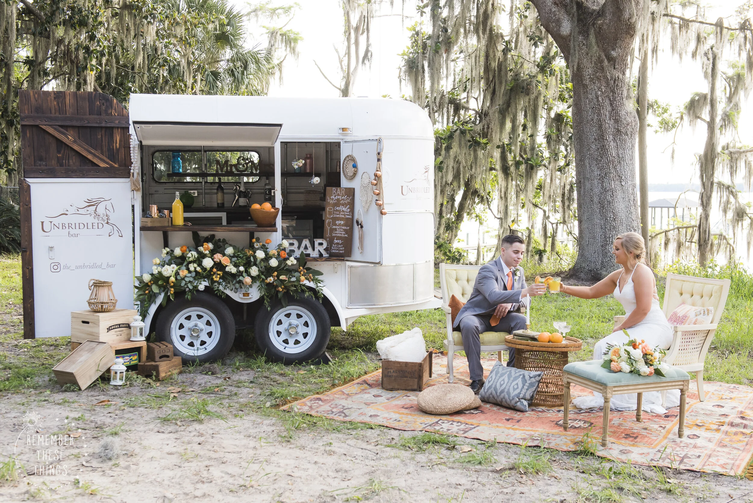 The Unbridled Bar came from a glass of wine and Pinterest after a long Friday night shift. I could see that there were a few mobile bar trailers in other markets like Texas and California, but no one had started one here in Jacksonville. I talked my husband into it and we started searching for the right horse trailer to convert. I drew up the plans for the inside, to make it functional and to get enough work space out of such a small area. I didn't just want a “trendy” bar. It had to make sense to me as a bartender. Running water and electricity was a must, it had to have a kegerator so we could showcase the great beer in Jacksonville, and storage was also key. I had previously met the owners of Hippie & Him, who enthusiastically took on the job of making my plans a reality. There was lots of dreams, sweat, and labor that went into the building of The Unbridled Bar and I couldn't be more ecstatic with the end results. She was done in October of 2018, our first wedding was November of 2019, and we haven't stopped since.